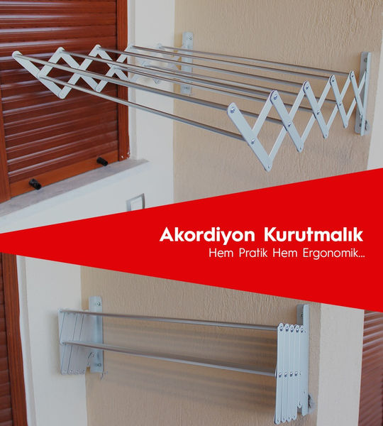 Katlanır duvar tipi özel tasarım çamaşırlık kullanılırken çok yük taşır, kullanmadığınız zaman ise katlanır ve yer kaplamaz. Çamaşırları kurutmak yıkamak kadar zordur. Askınıza asmak o askıyı muhafaza etmek, tekrar katlayıp kaldırmak bir işkence haline dönüşür. Katlanabilir Akordiyon çamaşır askısı ile askıyı toplayıp bir yere kaldırmadan, yer kaplamadan çamaşır kurutmanın keyfine varın. Çamaşırlarınızı asın kurusun, kuruduktan sonra toplayın ve askıyı duvara doğru ittirin. Hepsi bu kadar. Hem yer kaplamaz hem de paslanmaz yapısıyla gayet şık görünür.